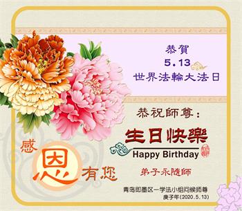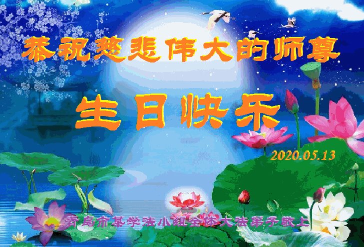 师父:您好!叩拜师尊! 五月十三日是您的生日,恭祝慈悲伟大的师尊生日快乐!庆祝法轮大法洪传二十八周年暨世界法轮大法日二十一周年! 二十八年前的五月十三日,您开启了天门,向世间洒下甘露,把法轮佛法洪传全球,使末劫的众生有了得救希望。 感恩师尊的慈悲苦度!是师尊在恶毒的现世中为弟子拂去历史的尘封显露本性,又带弟子走向回家的路——返本归真的路,师尊为弟子做了什么我们无法知道,但我们知道修炼的路上都是在师尊的保护和保护下才走到了今天。能够成为师尊的弟子,我们是多么的幸福、多么的幸运,美好的心情无以言表,用人间的语言无法表达弟子对您的感恩之情。在末劫的最后,弟子一定做好三件事,修好自己,多救众生,圆满随师还。 谢谢师父!合十! 二零二零年五月九日 山东省青岛市大法弟子恭祝最伟大的师尊生日快乐!