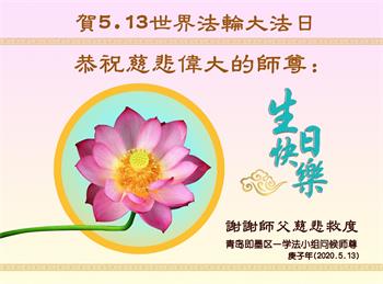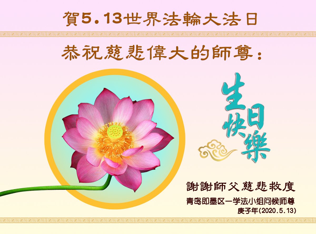【明慧网二零二零年五月十四日】 山东省青岛平度全体大法弟子恭祝慈悲伟大的师尊生日快乐!恭贺世界法轮大法日!