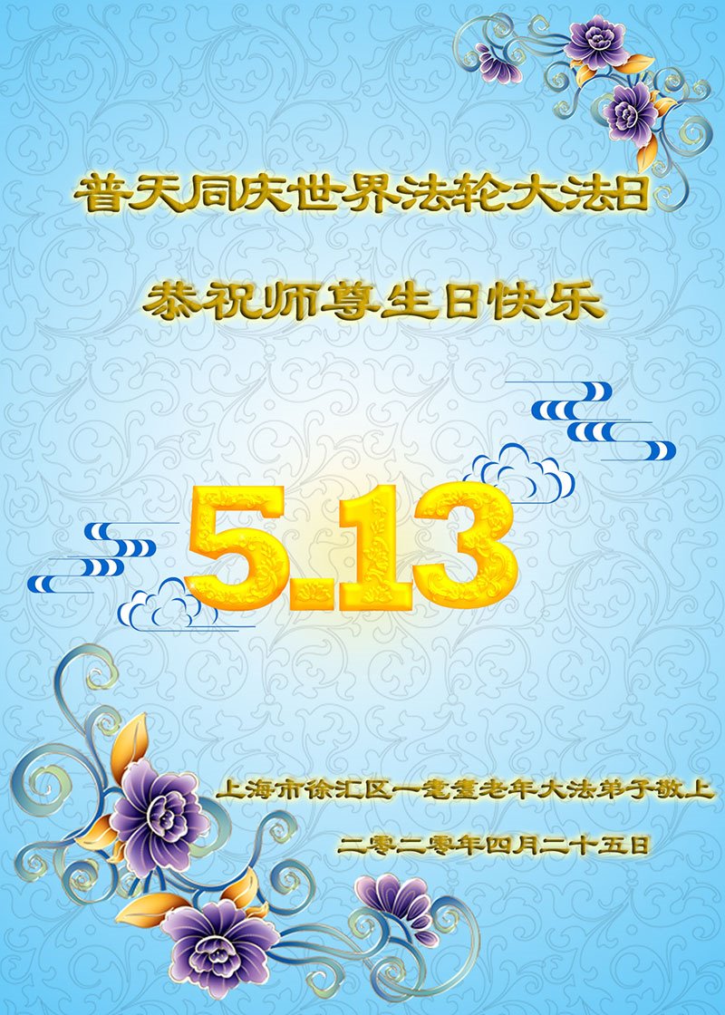 恭祝师尊生日快乐! 普天同庆、同颂、同贺世界法轮大法日! 上海市徐汇区一耄耋老年大法弟子恭祝慈悲伟大的师尊生日快乐!恭贺法轮大法洪传世界二十八周年!