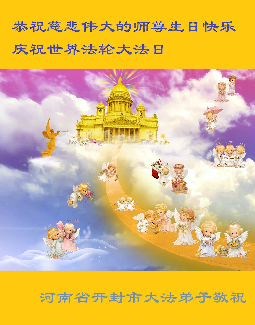 值此世界法轮大法日来临之际,开封市大法弟子向慈悲伟大的师尊表示最诚挚的问候,恭祝师尊生日快乐!弟子谨记师尊的教诲多学法,实修自己,不辜负师尊的慈悲苦度! 开封市大法弟子叩拜 合十! 河南省洛阳市大法弟子一家恭祝师尊生日快乐!