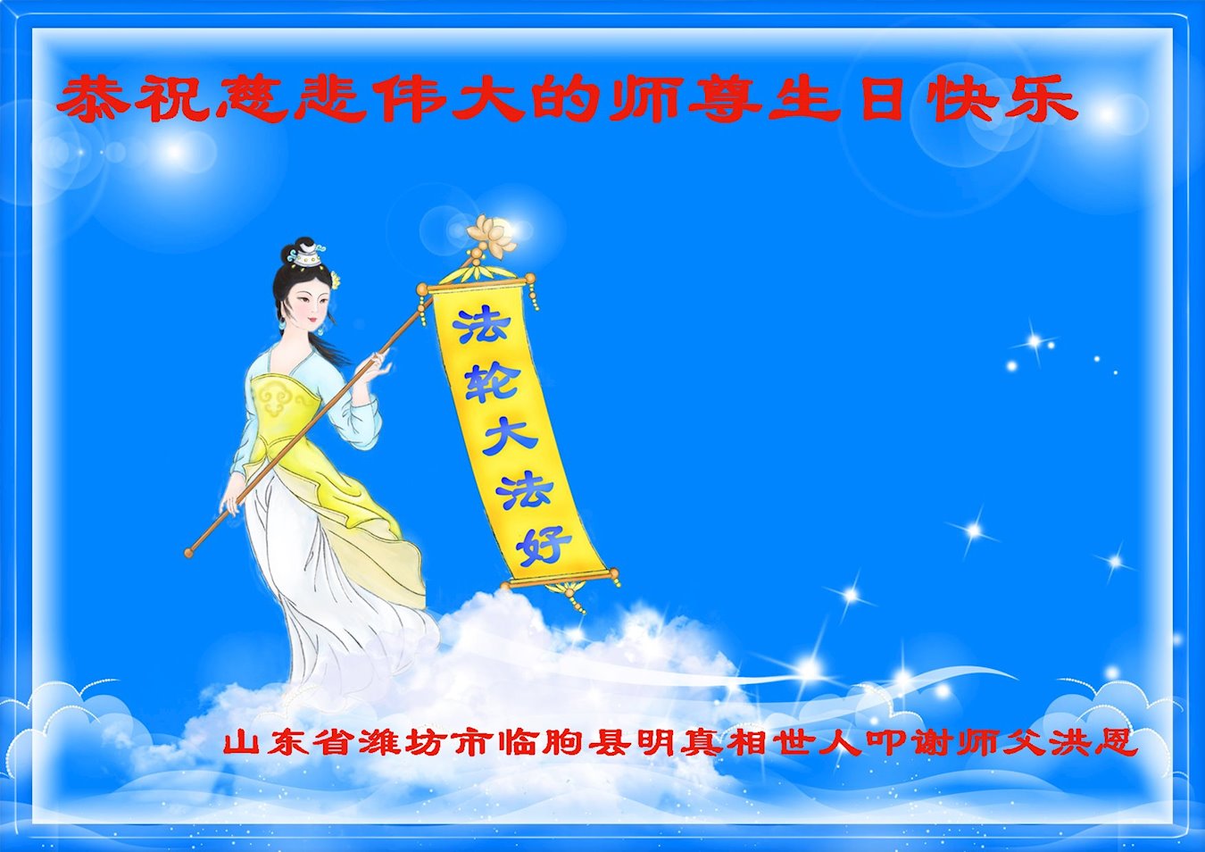 山东省潍坊市临朐县一学法小组大法弟子恭祝师尊生日快乐!普天同庆5.13世界法轮大法日!