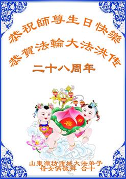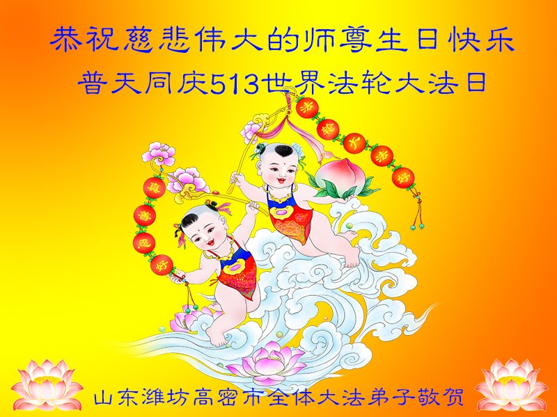 山东潍坊市高密三名大法弟子恭贺5.13世界法轮大法日!恭祝慈悲伟大的师尊生日快乐!