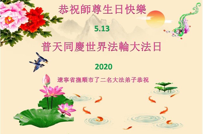 【明慧网二零二零年五月十四日】 辽宁省抚顺市二名大法弟子恭祝世界法轮大法日!