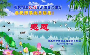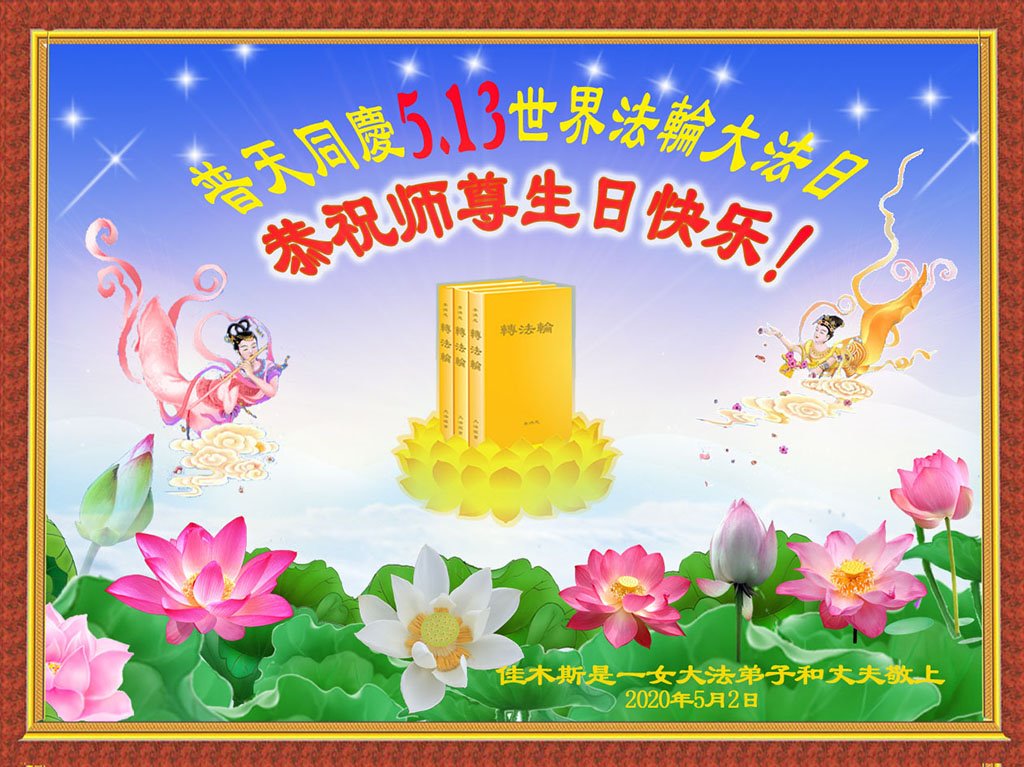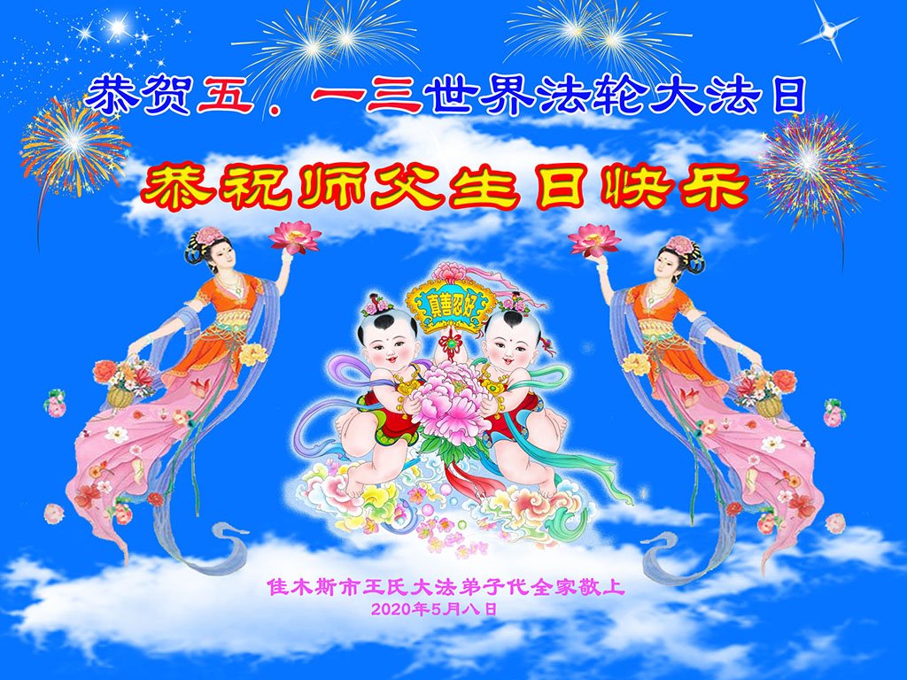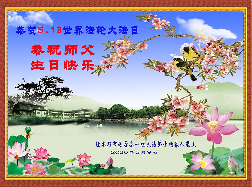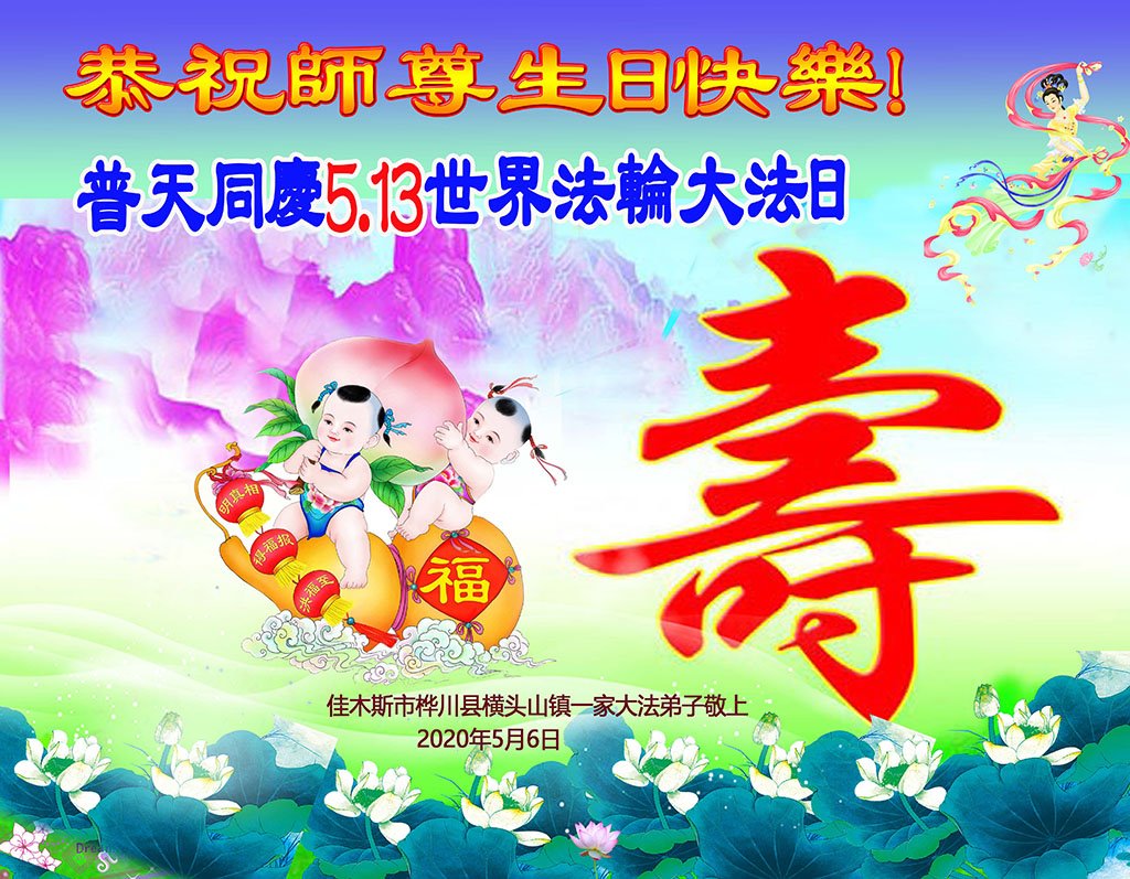 【明慧网二零二零年五月十四日】 黑龙江省佳木斯市桦川县横头山镇一家大法弟子恭祝慈悲伟大的师尊生日快乐!