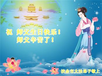 在二十年多的正法修炼中,弟子坚定的走在神的路上。魔难中一次次闯关,都是伟大恩师一路看护着我,才走到今天。在今后时间里,我要更加精進实修,做一个合格的大法弟子,跟师尊回家。感恩师尊慈悲救度!一人修炼全家受益,我们全家人都受到大法师父的保护! 在这普天同庆之际,我们全家祝师尊生日快乐! 吉林松原一大法弟子恭祝师尊生日快乐!