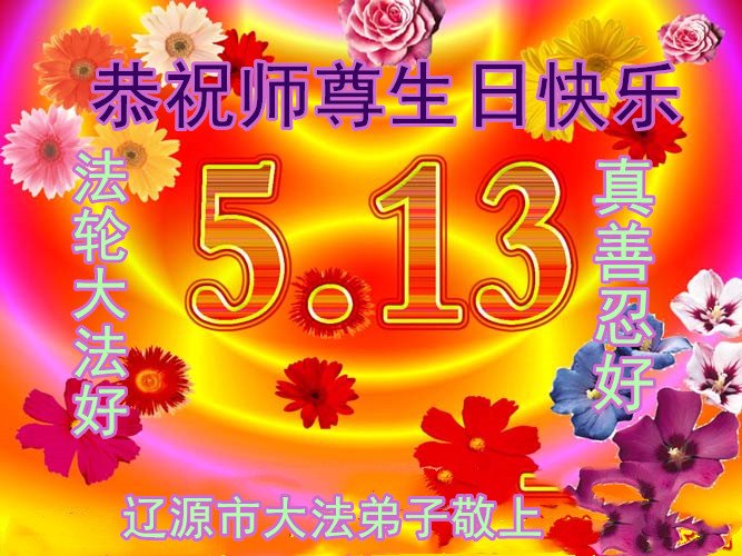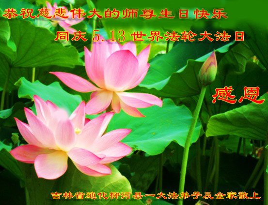 恭贺5月13日世界法轮大法日,感恩师尊救度。中国大陆吉林地区在外漂泊大法弟子向师尊问好。请师尊放心,我们会走好每一步,做好三件事救度众生。 吉林省白山市大法弟子恭祝师尊生日快乐!