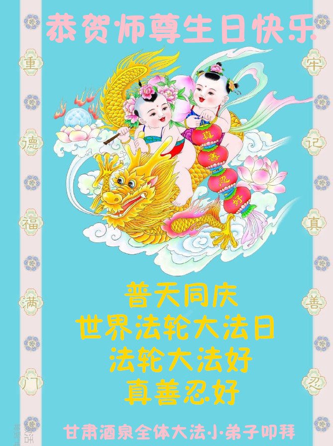 师父您辛苦了!我要走师父您给安排的修炼之路,坚定实修自己。带好大法小弟子,鼓励家人大法弟子早日回归到正法洪流中,共同兑现自己的誓约。 甘肃省酒泉市全体大法小弟子恭祝师尊生日快乐!