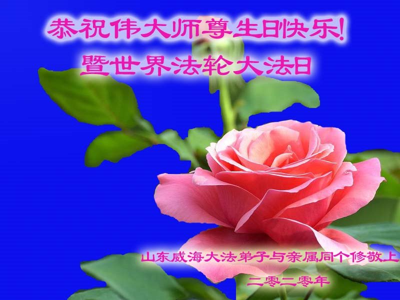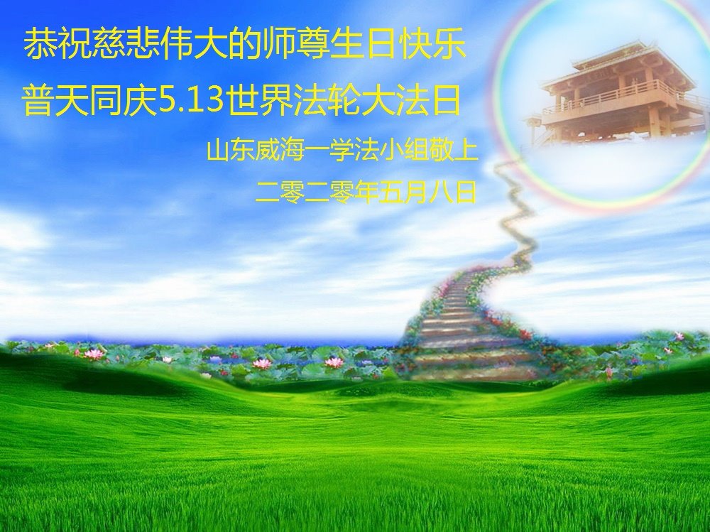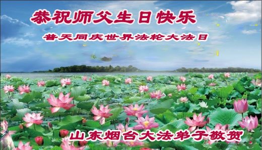 恭祝师尊生日快乐!感谢师尊慈悲救度!师尊您辛苦了! 同庆法轮大法弘传世界二十八周年暨第二十一届世界法轮大法日! 山东省烟台市一学法小组大法弟子敬上 山东省威海市一学法组大法弟子恭祝伟大的师尊生日快乐!