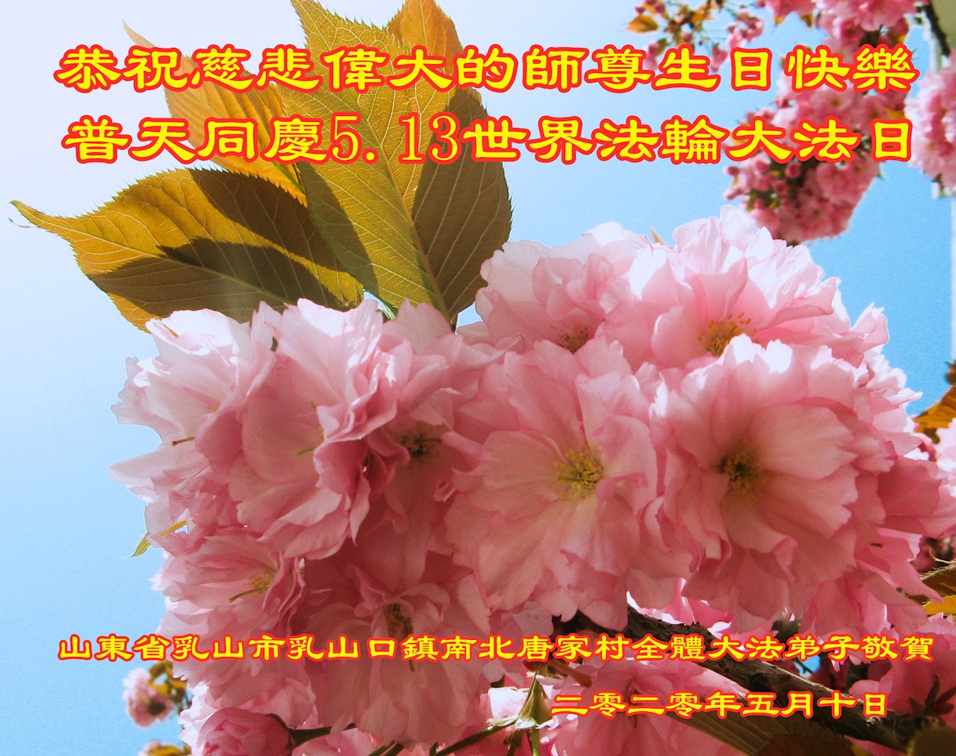 普天同庆5.13世界法轮大法日 感恩师尊赐予我们宇宙大法,让我们成为了最幸运的生命,师父您辛苦了。未来的修炼路上,弟子尽快的放下人心,去掉执着,正念正行正信正悟的走好师父给安排的修炼路,叩谢师恩, 合十! 山东省威海市乳山市乳山口镇南北唐家村全体大法弟子恭祝慈悲伟大的师尊生日快乐暨普天同庆5.13世界法轮大法日!