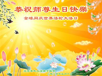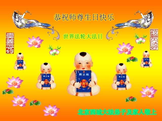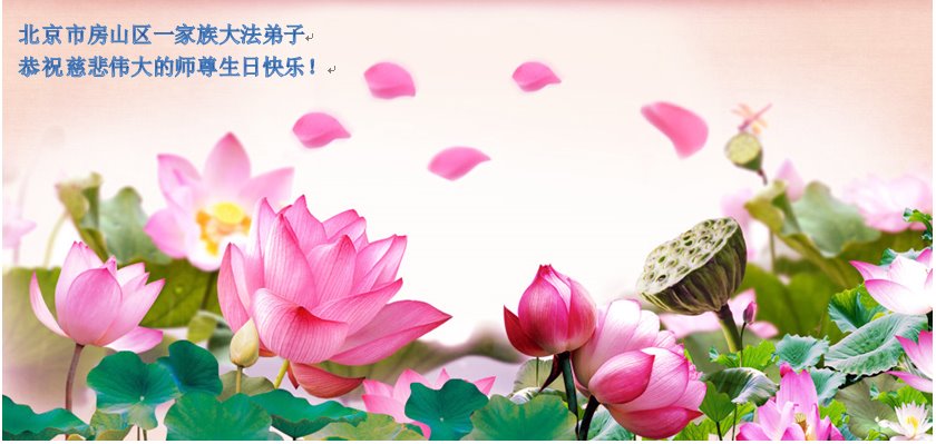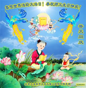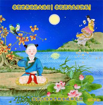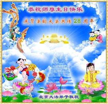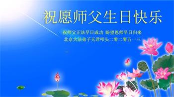 在世界法轮大法日和伟大的师尊生日来临之际,衷心的向师父问好!谢谢师父为拯救我们所做的一切! 北京市朝阳区、海淀区三位大法弟子恭祝师尊生日快乐!恭贺世界法轮大法日!