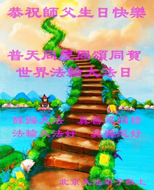 普天同庆世界法轮大法日! 修炼中一次次的摔倒,是师尊用巨大的承受将我扶起,迷在人中时是师尊将我苦苦唤回。无法用言语表达对师尊的感恩,谢谢师尊带我回家,我将修好自己,兑现自己的誓约,救度世人。 北京大法弟子敬上 北京西城区大法弟子恭祝慈悲伟大的师尊生日快乐!