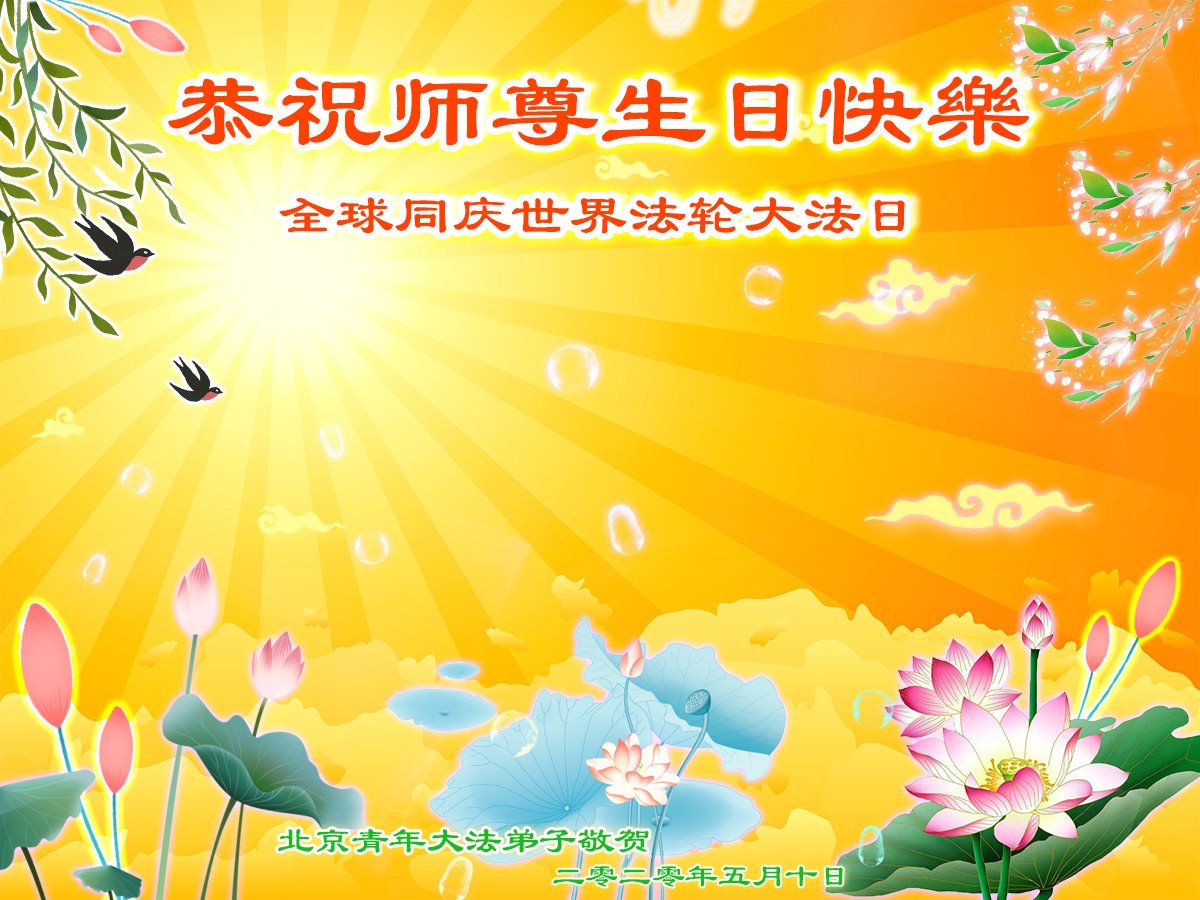 恭贺世界法轮大法日! 敬谢师父救度洪恩!弟子们不忘师恩,做好三件事。 弟子们跪拜恩师 2020年5月10日 北京市大法弟子恭祝慈悲伟大的师父生日快乐!