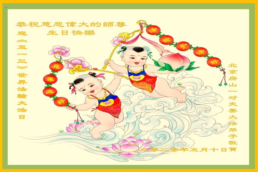 喜迎五一三世界法轮大法日,北京房山一对夫妻大法弟子恭祝师父生日快乐!感恩师尊苦度,叩拜! 北京怀柔全体老年大法弟子恭祝师尊生日快乐!恭贺世界法轮大法日!
