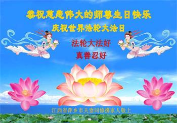 江西省萍乡市夫妻大法弟子携家人恭贺师尊华诞暨法轮大法日!