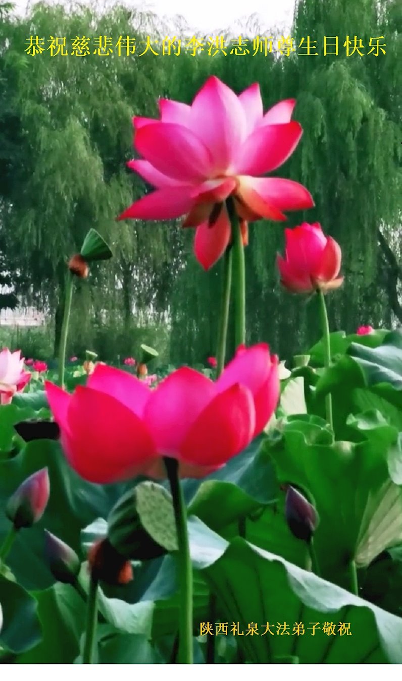 大法弟子恭祝慈悲伟大的师尊生日快乐!恭贺世界法轮大法日! 我是1998年得法大法弟子,今年71岁,在最艰难、最困苦、最绝望中,在伟大慈悲师尊的慈悲救度与保护下走了过来。师父给予了我第二次生命,让我走進大法,领悟了人生的真谛,谢谢师尊的慈悲救度与保护! 师父,您为了我们大法弟子和所有得救的众生日夜操劳,真的是太辛苦了!弟子们在此叩拜与感恩!永远的感恩!弟子们时刻牢记自己是正法时期的大法徒,时刻不忘这神圣的使命—多救人。作为正法时期的大法弟子,我们万分的幸运,同时也深感责任重大。做好三件事,兑现史前誓约,圆满随师还! 我们一家修炼人和没修炼的常人叩拜师尊!恭祝师尊生日快乐!普天同庆法轮大法日! 咸阳市礼泉县大法弟子 陕西省咸阳市三原县全体大法弟子祝贺师尊生日快乐!