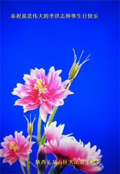 佛光普照我们大家庭,三千年一开的优昙婆罗花,在我们家玻璃窗子上绽放,法轮在我们家炕头旋转。谢谢师父救度!“真、善、忍”已深深扎根于我们的心里。我们想念师父!再祝师父生日快乐! 陕西宝鸡大法弟子恭祝师尊生日快乐!