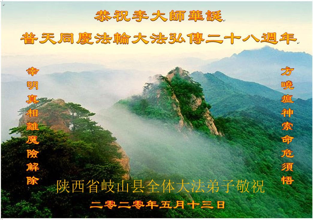 陕西省宝鸡市岐山县全体大法弟子恭祝师父生日快乐!普天同庆法轮大法弘传二十八周年!