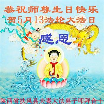 陈仓区全体大法弟子叩拜慈悲伟大的师尊,师父好!师父辛苦了。 陕西省咸阳市一大法弟子全家恭祝师父生日快乐!恭贺世界法轮大法日!