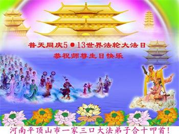 河南平顶山市一家三口大法弟子恭祝慈悲伟大的师尊生日快乐!庆祝5.13世界法轮大法日!