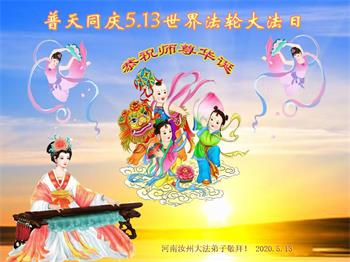 师父好!转眼迎来了2020年的世界法轮大法日,在这个神圣的节日里,首先感谢师父把这么好的功法——法轮大法传度我们!我们濮阳地区大法弟子祝贺法轮大法日!庆祝全球今天这个普天同庆的日子!法轮大法好!真、善、忍好!感谢师尊多年来一路上对我们的慈悲保护!师尊在这些为众生延长的时日里,我们唯有多学法、学好法,坚定正念,多救人,才能做好三件事,才能不辜负师尊的慈悲苦度,才能兑现自己的历史使命。 最后叩谢师尊!合十 河南省周口市一学法小组五老年大法弟子恭祝慈悲伟大的师尊生日快乐!