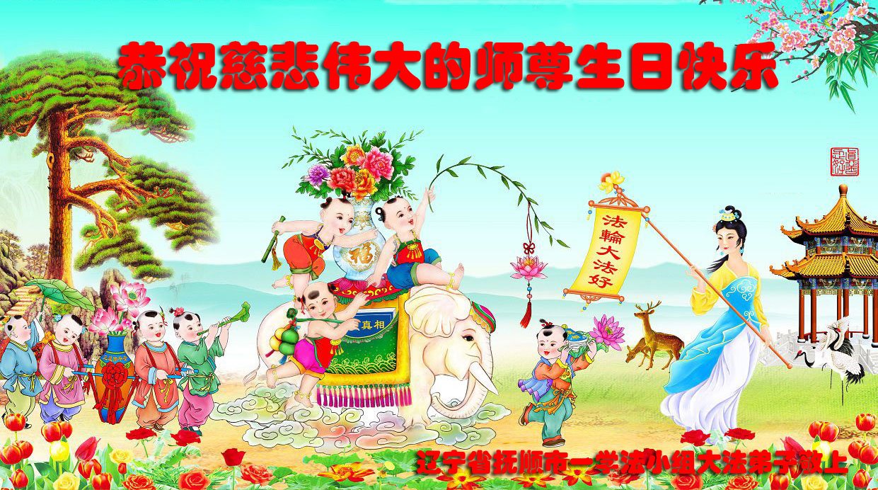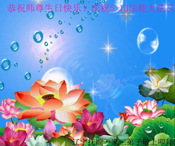 恭祝师尊生日快乐!庆祝5·13世界法轮大法日! 我们坚定的信师信法,不辜负师尊的教诲,做好三件事,履行誓约,圆满随师还! 辽宁抚顺一家三弟子叩拜 辽宁省抚顺市一学法小组大法弟子恭祝师父生日快乐!普天同庆世界法轮大法日!