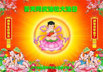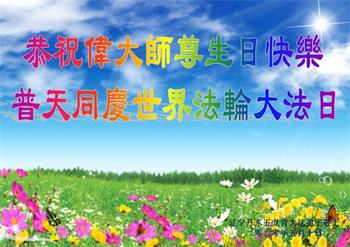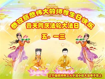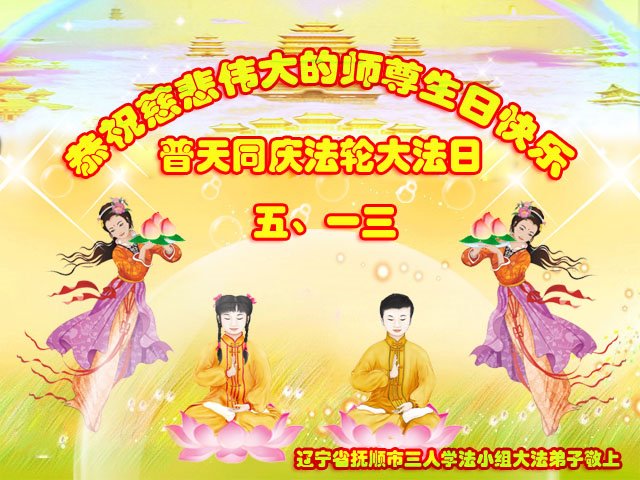 恭贺世界法轮大法日! 辽宁抚顺县一大法弟子全家恭贺世界法轮大法日!恭祝慈悲伟大的师父生日快乐!