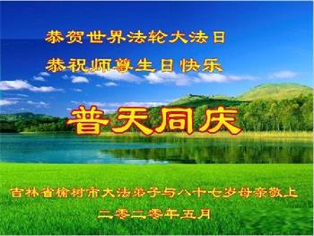 吉林省长春市榆树市大法弟子与八十七岁母亲恭贺世界法轮大法日恭祝师尊生日快乐!