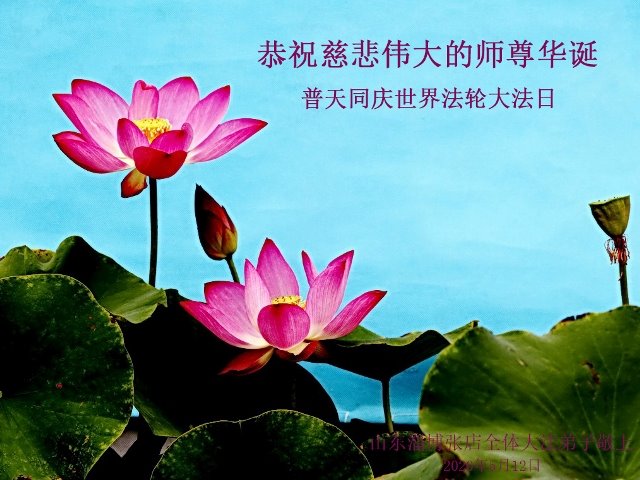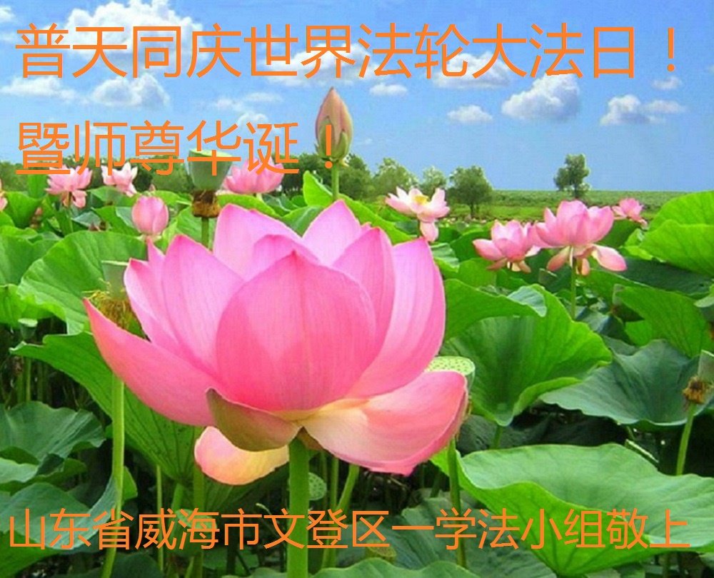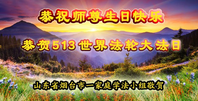 山东烟台市莱山区一学法小组大法弟子恭祝慈悲伟大的师尊生日快乐!恭贺世界法轮大法日!