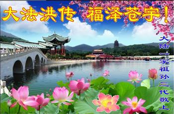 大陆一大法弟子全家三人恭祝慈悲伟大的师父生日快乐!恭贺世界法轮大法日!