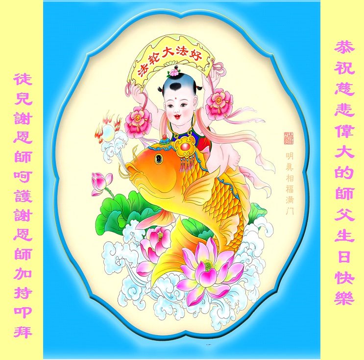在2020年5月13日来临之际,弟子远在万里向师尊合十问好!恭祝师父六十九华诞生日快乐! 谢谢师父在重组大穹中自始至终以莫大的慈悲看护和加持弟子走到今天,让师尊操尽了心,弟子无以言表铭记于心,唯有修好自己走好走正最后的路,完成自己的历史使命,兑现与师尊的誓约,不负众生的期望。 2020年5月10日 大法弟子恭祝师父生日快乐!