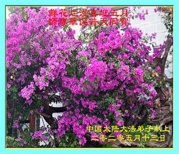 五月的颂歌 五月的阳光格外明媚 五月的鲜花芬芳飘逸 五月的清风自在惬意 五月的幸福甜醉四溢 五月的清江奔流到海 五月的山峦苍翠欲滴 五月的思念随波奔涌 五月的颂歌乘风飘飞 啊 伟大的佛法开创苍穹 伟大的恩师主掌天地 唱不尽的颂歌感不尽的洪恩 永永远远年年岁岁 中国大陆一制作组全体法徒叩拜! 二零二零年五月 大陆大法弟子恭贺世界法轮大法日暨师尊华诞!