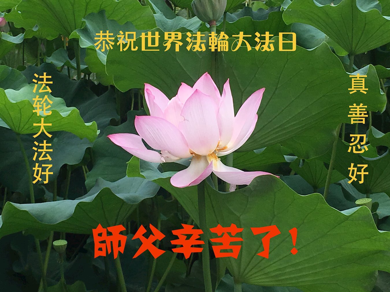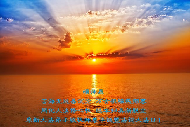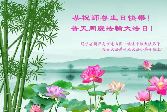 感恩师尊把弟子从迷茫和黑暗领向光明和修炼之路,弟子叩谢师尊! 辽宁省葫芦岛连山区一学法小组大法弟子恭祝师尊生日快乐!普天同庆法轮大法日!