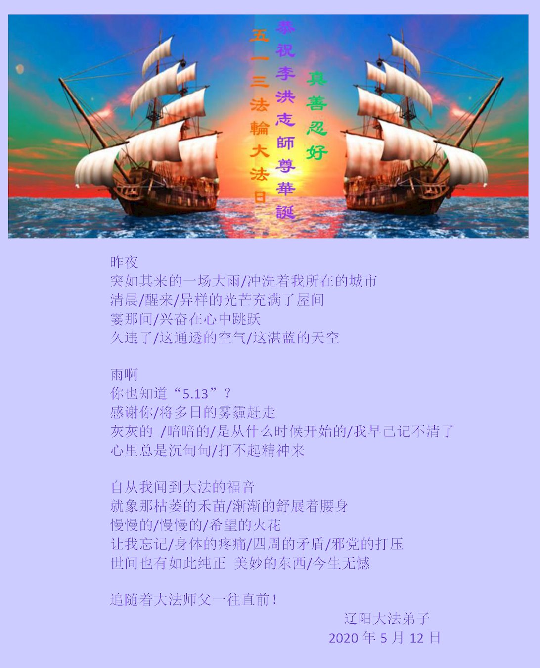 昨夜 突如其来的一场大雨/冲洗着我所在的城市 清晨醒来,异样的光芒充满了屋间 霎那间,兴奋在心中跳跃 久违了,这通透的空气,这湛蓝的天空 雨啊 你也知道“5.13”? 感谢你将多日的雾霾赶走 灰灰的,暗暗的,是从什么时候开始的/我早已记不清了 心里总是沉甸甸,打不起精神来 自从我闻到大法的福音 就象那枯萎的禾苗,渐渐的舒展着腰身 慢慢的,慢慢的,希望的火花 让我忘记身体的疼痛,四周的矛盾,邪*党-的打压 追随着大法师父一往直前 世间也有如此纯正、美妙的东西,今生无憾 2020年5月12日 辽宁省阜新市大法弟子恭祝师尊生日快乐!
