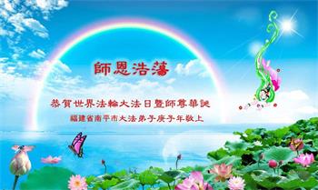 合肥大法弟子恭祝法轮大法日的到来。在此,向伟大的师尊道一声:“师父好!师父您辛苦了!”感谢师尊的慈悲苦度,弟子叩谢,合十。 福建省南平市大法弟子恭贺世界法轮大法日及师尊华诞!