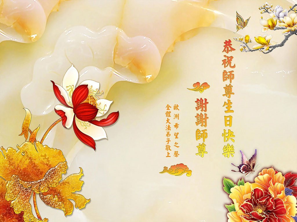 谢谢慈悲伟大的师父!谢谢师父赋予我们正法时期大法弟子的称呼!师父您辛苦了!我们会整体配合,正念正行,做好三件事,利用媒体有利的条件救度众生,让更多的世人了解真相,让师父放心。欧洲希望.之声全体大法弟子敬上! 比利时大法弟子恭祝师尊生日快乐!