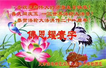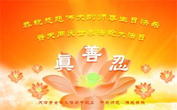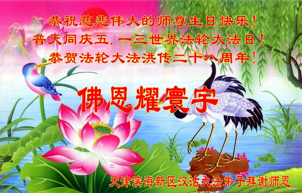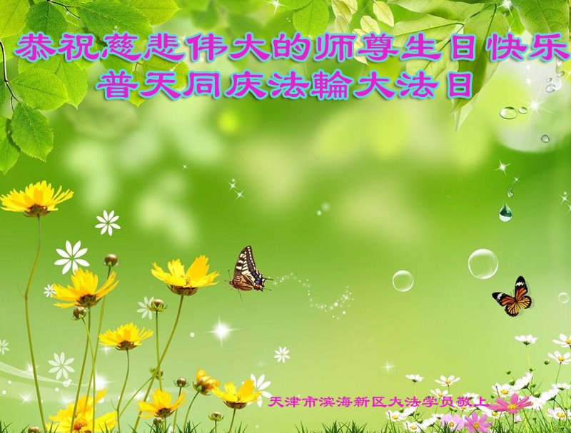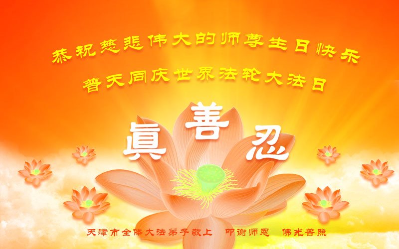 恭祝师尊生日快乐! 天津市全体大法弟子恭祝慈悲伟大的师尊生日快乐!普天同庆世界法轮大法日!