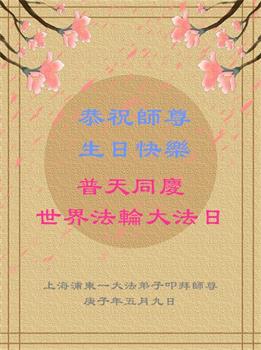 在师尊生日即将到来之际,弟子怀着无比崇敬、感恩的心情,恭祝慈悲伟大的师尊生日快乐! 师尊您好!您辛苦了!您为救度弟子及宇宙众生付出的一切艰辛,您的慈悲与伟大,穷尽弟子的智慧也无法想象,穷尽人类语言也无法表达弟子对您的感恩。弟子只有按照师尊的教诲,学好法,尽快修去人心执着,努力做好三件事,兑现誓约,不辜负师尊慈悲苦度。 弟子跪拜师尊! 北京市丰台区一大法弟子敬上 二零二零年五月十一日 上海市全体大法弟子恭祝师尊生日快乐!