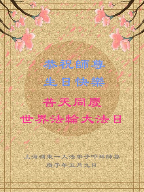 恭祝师尊生日快乐!叩拜师尊! 在正法的最后时刻,弟子谨记师尊的教诲,抓紧做好三件事,遇事向内找,多救人,紧跟师父正法進程,跟随师父進入新宇宙真正的家园 上海浦东一大法弟子全家恭贺师尊华诞暨法轮大法弘传二十八周年!