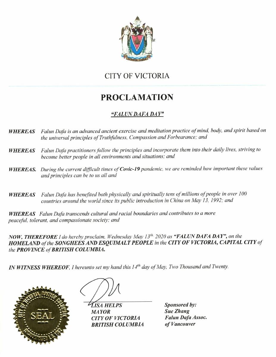 【明慧网二零二零年五月十八日】2020年5月13日是法轮大法开传28周年纪念日、第21届“世界法轮大法日”,也是法轮功创始人李洪志先生69岁的华诞。在此普天同庆的日子,加拿大联邦、省、市议员纷纷向法轮大法学会发来贺信、嘉奖令和褒奖。继加拿大西部的3位国会议员和7位市长发来贺信和褒奖之后,加拿大卑诗省首府维多利亚市长和温哥华地区Cloverdale-Langley City选区国会议员塔玛拉·詹森(Tamara Jansen)也发来褒奖与贺信。 图1:加拿大卑诗省首府维多利亚市长颁发褒奖,宣布法轮大法日。 |