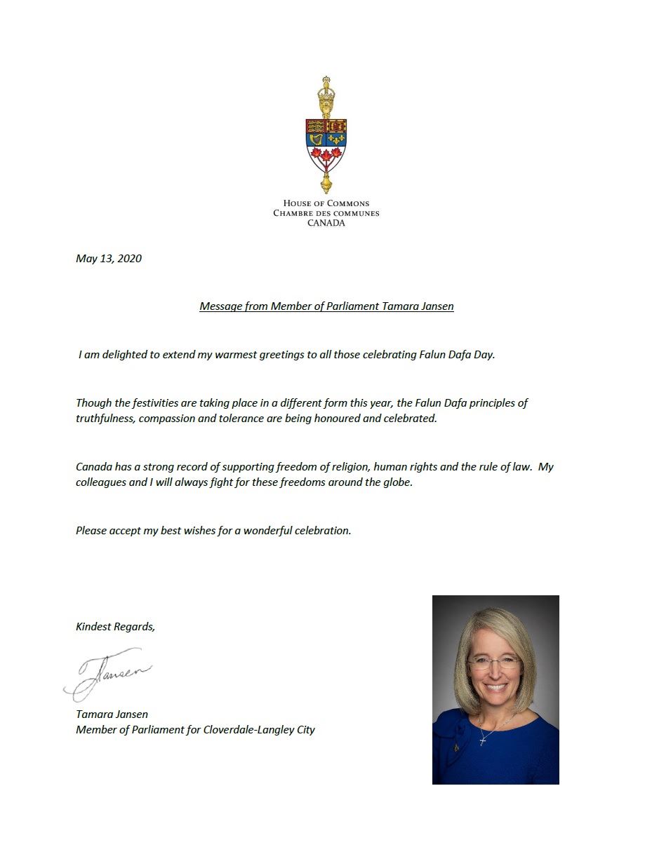 来自卑诗省维多利亚市长的褒奖: 鉴于,法轮大法是一个古老的、以“真善忍”宇宙特性为指导的上乘性命双修功法; 鉴于,法轮大法修炼者在日常生活中遵循“真善忍”的修炼原则,在任何环境、任何情况下都要求做一个更好的人; 鉴于,当前在Covid-19瘟疫大流行的困难时期,我们意识到这些价值观和准则对所有人来说都至关重要; 鉴于,自1992年5月13日法轮大法在中国面向公众传出后,为超过100多个国家的上千万民众带来了身心的健康; 鉴于,法轮大法超越了文化和种族的界限,为建立一个更加和平、包容和富有同情心的社会带来贡献, 鉴此,我,市长丽莎·贺普斯(Lisa Helps),特此宣布二零二零年五月十三日为维多利亚市——卑诗省府、SONGHEES和ESQUIMALT人民的故乡——“法轮大法日”。 市长丽莎·贺普斯  图2:温哥华地区Cloverdale-Langley City选区国会议员塔玛拉·詹森(Tamara Jansen)祝贺法轮大法日的贺信。 |