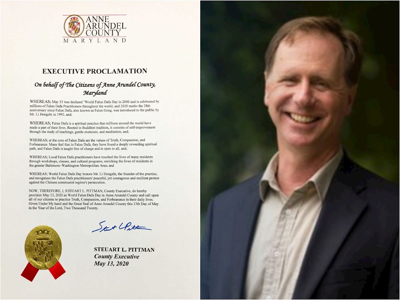 【明慧网二零二零年五月二十三日】在第二十一届世界法轮大法日及法轮大法传世二十八周年之际,美国马里兰州安妮阿伦德尔郡(Anne Arundel)郡长斯图尔特·皮特曼 (Steuart L. Pittman)颁发褒奖,向法轮大法创始人李洪志先生表示敬意,并表彰法轮大法修炼者和平、勇敢、坚韧地反抗中共政权的迫害。皮特曼郡长宣布二零二零年五月十三日为安妮阿伦德尔郡“世界法轮大法日”,并呼吁所有民众在他们的日常生活中实践“真、善、忍”。 图1:美国马里兰州安妮阿伦德尔郡郡长斯图尔特·皮特曼(Steuart L. Pittman)为第二十一届“世界法轮大法日”颁发的褒奖。 |