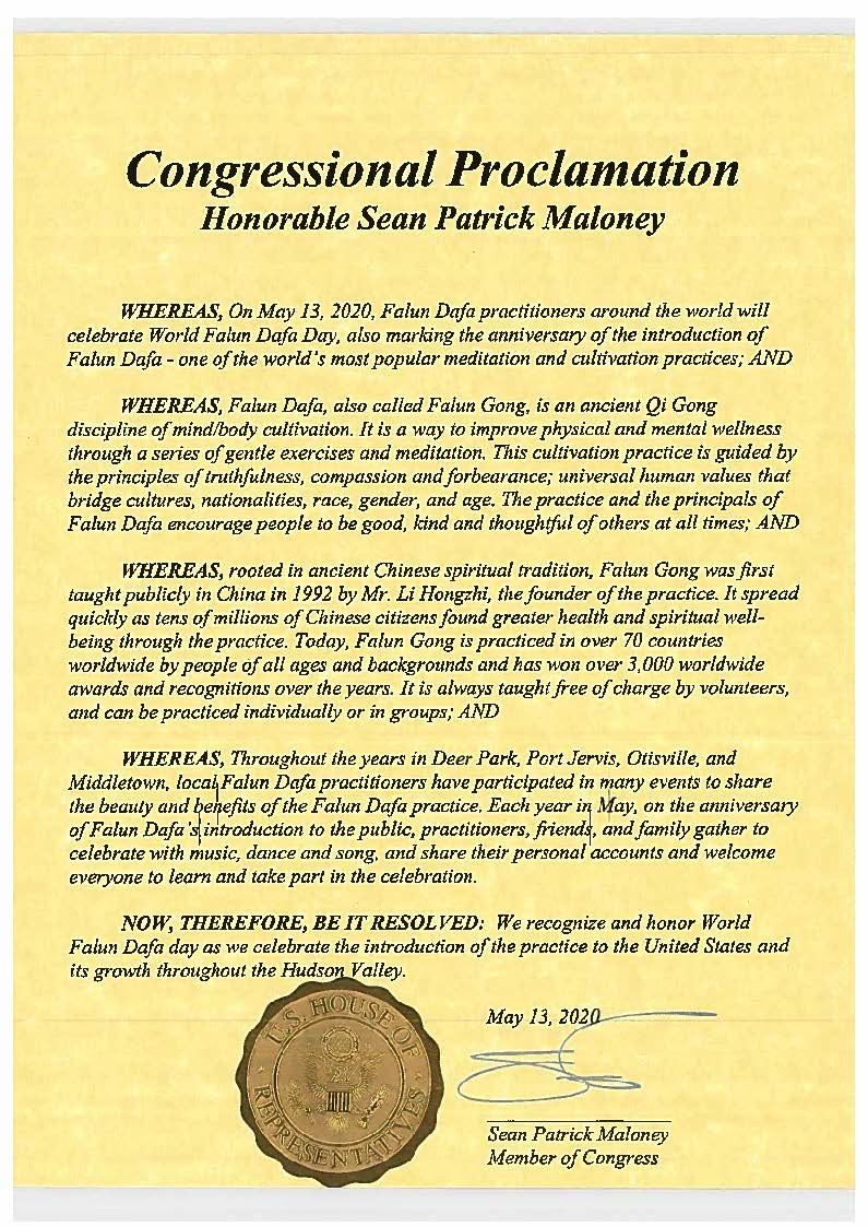 纽约国会议员艾略特·恩格尔(Eliot L. Engel)是美国众议院外交委员会主席。他在给纽约法轮功学员的贺信中说:“向今年五月在纽约第十六社区和全世界庆祝世界法轮大法月的人们致以最热烈的问候。法轮大法以“真、善、忍”为原则,为全球数百万人提供了高水平的打坐和锻炼方法。这种和平、精神的实践帮助人们应对压力的同时,积极的改善他们的思想和身体,非常有实效。这一点现在尤其重要。我很高兴在你们庆祝法轮大法月时表示祝贺,并同你们一起关注那些生活在被剥夺修炼、信仰和良心自由的国家的人们。对此,我们必须保持警惕。” 纽约第十八选区国会议员马洛尼(Sean P. Maloney)发来褒奖 祝贺法轮大法日  图3:纽约第十八选区国会议员肖恩·马洛尼(Sean P. Maloney)发来褒奖令祝贺法轮大法日。 |