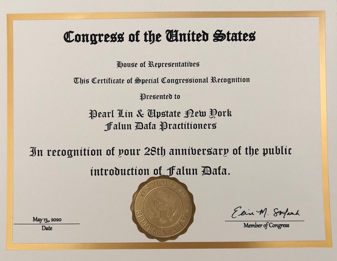 褒奖令译文如下: 国会褒奖状鉴于,二零二零年五月十三日,世界各地法轮大法修炼学员都将庆祝世界法轮大法日,也标志着法轮大法弘传二十八周年——这个世界上最盛行的打坐和修炼方式;并且 鉴于,法轮大法,也被称为法轮功,是一种古老的性命双修功法。这是一种通过舒缓的动功和打坐,以增进身心健康的功法。法轮大法修炼以“真、善、忍”为指导原则,其普世生命价值跨越文化,民族,种族,性别和年龄的差异。法轮大法修炼及其原则激励人们在任何情况下做好人、心地善良、及为他人着想;并且 鉴于,法轮功,根植于古老中国的神传传统,由其创始人李洪志先生首次于一九九二年向公众介绍。法轮大法迅速传遍中国,数千万中国公民在实践中找到了更多的健康和精神福祉。今天,法轮功在世界各地七十多个国家被不同年龄和背景的人实践,并获得了三千多个褒奖。他总是由志愿者免费教功,可以单独修炼或集体一起炼功;并且 鉴于,在迪尔公园,杰维斯港,奥蒂斯维尔和米德尔敦,多年来,当地的法轮大法修炼者参加了许多活动,分享法轮大法的美好和超常。每年五月,在法轮大法向公众介绍的周年纪念日,法轮功学员,朋友和家人齐聚一堂,通过音乐、舞蹈和歌曲共同庆祝,分享他们的故事,并欢迎每个人学习功法并加入庆祝活动。 因此,现在,我们在庆祝法轮大法向美国传播及在哈德逊流域壮大时,我们褒奖二零二零年五月十三日是世界法轮大法日。  图4:纽约第二十一选区国会议员伊莉丝·斯特凡尼克(Elise M. Stefanik)发布特别认可证书表彰法轮大法洪传世界二十八周年。 |