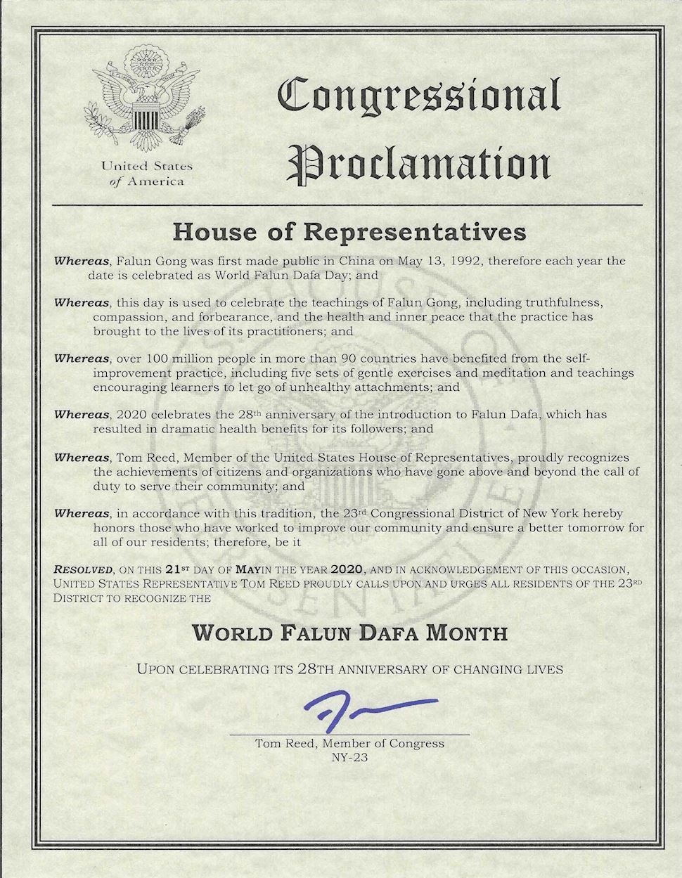纽约国会议员瑞德(Thomas W. Reed II)褒奖法轮大法对世人身心健康和社区做出的贡献 祝贺大法弘传二十八周年  图5:纽约第二十三选区国会议员汤姆斯·瑞德(Thomas W. Reed II)褒奖法轮大法日,祝贺大法弘传二十八周年。 |