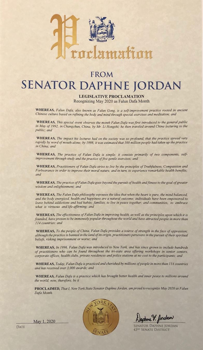褒奖令译文如下: 二零二零年五月——法轮大法月赞扬法轮大法学员 鉴于,一个伟大的州之所以伟大是因为有个人及组织为他们的社区提供杰出的服务,而该州对这一杰出服务表示感谢;并且 鉴于,法轮大法,也称法轮功,由李洪志先生于一九九二年五月十三日公开传出,有超过来自一百多个国家的一亿人受益于此自我改进的修炼功法;并且 鉴于,法轮大法修炼者遵循真善忍的原则,并努力在所有环境和各种情况下成为更好的人;并且 鉴于,法轮大法的五套柔和功法包括动功和打坐,鼓励学员放下不健康的执着,许多纽约人从修炼中受益,并且发现家庭由此变得和睦,学习和工作变得更顺利;并且 鉴于,全世界的法轮大法修炼者正在庆祝法轮大法公开传出二十八周年;并且 鉴于,法轮大法修炼者将在二零二零年五月十三日庆祝法轮大法日; 特此,我,安德莱亚·斯图尔特-卡曾斯(Andrea Stewart-Cousins),作为纽约州参议员和参议院多数党领袖,肯定法轮大法修炼者的重大贡献和成就,特此与第三十五选区的居民一起褒奖五月为法轮大法月。 纽约州参议员乔丹(Daphne Jordan)褒奖法轮大法月 赞扬法轮大法为世界上亿人带来健康的身体与平和的内心  图7:纽约第四十三选区州参议员达芙妮·乔丹褒奖法轮大法月。 |