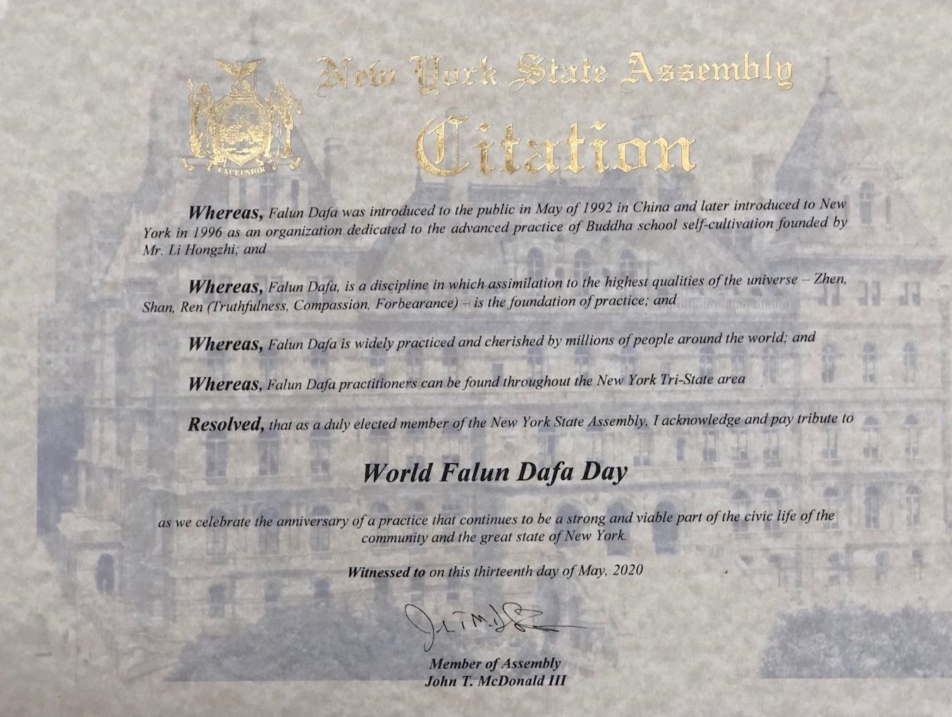 褒奖令译文如下: 二零二零年五月——法轮大法月鉴于,法轮大法是根植于中国古老文化,通过锻炼与打坐,净化身心灵的一种自我提升的修炼方法; 鉴于,一九九二年五月,李洪志先生首先在中国长春向公众介绍了法轮大法,其后,他在中国其他地方办班讲法; 鉴于,他的讲法对社会的影响如此深远,以至于,仅凭口耳相传,据估计,截至一九九八年,中国有一亿人修炼法轮大法; 鉴于,法轮大法的修炼简单易行,他主要由两部份组成:学法和炼习五套功法; 鉴于,法轮大法修炼者以“真、善、忍”为原则指导他们的生活,提高他们的道德标准,并且祛病健身有奇效; 鉴于,法轮大法的修炼超越了祛病健身,将达到开智开慧的目的; 鉴于,法轮大法的理念支持:当心灵纯净,心态平衡,人自然会精力充沛、健康快乐;个人会摒弃各种不良瘾好和习惯;家庭会和睦;社区会嘉许德行与向上的人生观; 鉴于,法轮大法健身的奇效,和其所基原则的广受欢迎,吸引了超过一百多个国家的民众; 鉴于,虽然在其发祥地遭受迫害,但法轮大法是中国民众力量的源泉。法轮大法修炼者面对监禁甚至是更残酷的迫害,矢志追求他们的精神信仰; 鉴于,一九九六年,法轮大法被介绍到纽约。自那时起,法轮大法修炼者数量增长,包括纽约上州的数百名法轮大法修炼者。他们在老年中心、公司办公室、健康俱乐部、私人住宅、警察局提供免费教功讲座; 鉴于,今天,全世界超过一百多个国家的上亿人修炼并珍视法轮大法,法轮大法获得超过三千项褒奖; 鉴于,法轮大法为世界上亿人带来健康的身体,平和的内心; 特此褒奖,我,纽约州参议员达芙妮·乔丹(Daphne Jordan)自豪的宣布,二零二零年五月为法轮大法月。  图8:纽约第一百零八选区州众议员约翰·麦克唐纳三世(John T. McDonald III)褒奖法轮大法日。 |