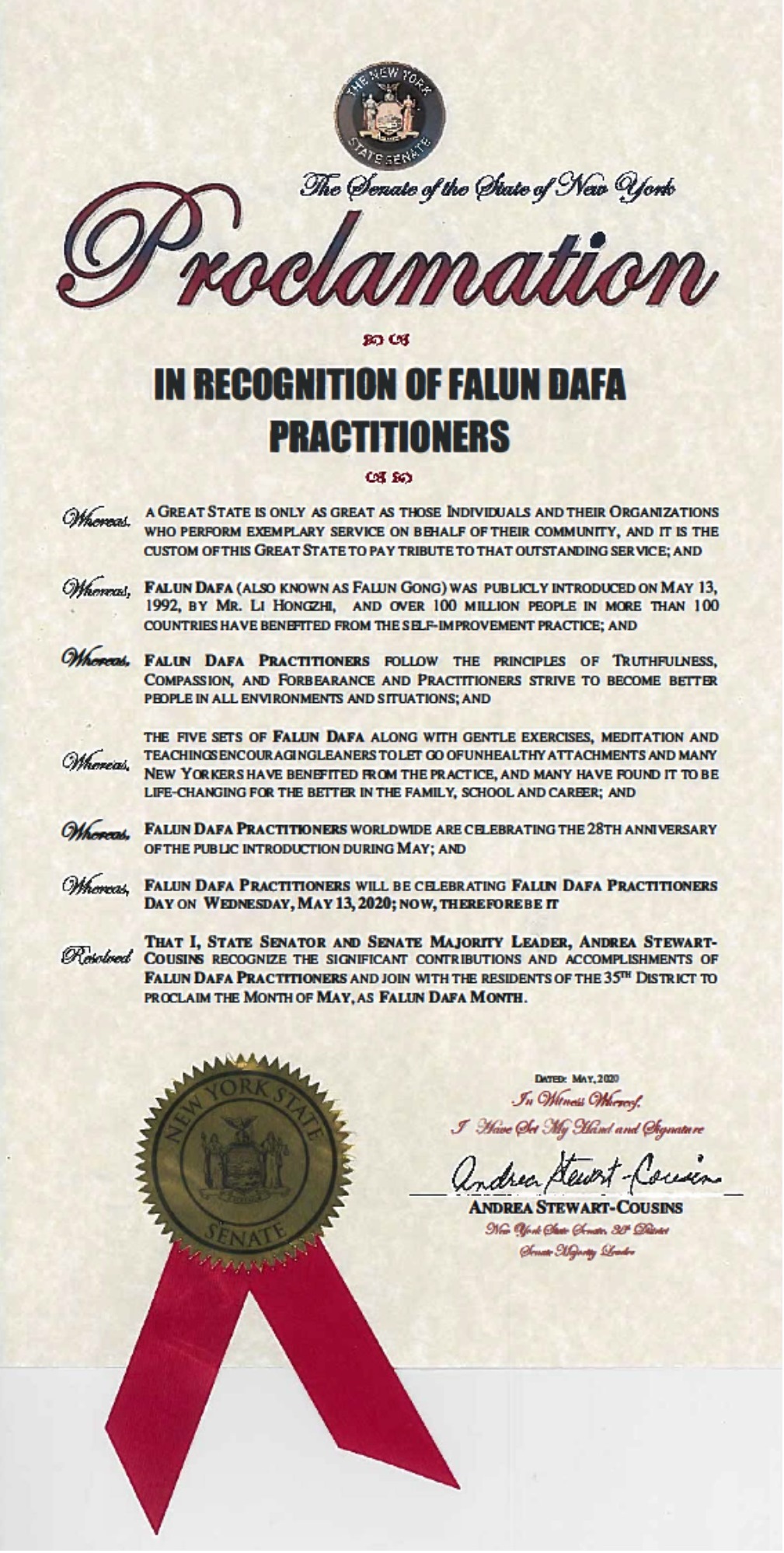 褒奖令译文如下: 众议院褒奖鉴于,法轮功在一九九二年五月十三日首次公开传出,每年的这一天已经作为“世界法轮大法日”来庆祝; 鉴于,这一天是用来庆祝法轮功传授给法轮功修炼者的法理,其中包括“真、善、忍”,以及给修炼者带来的身体的健康和内心的平静; 鉴于,这套自我提升的功法中有五套柔和的打坐炼功以及鼓励修炼者摒弃恶习的法理,他已使九十多个国家上亿的民众受益; 鉴于,二零二零年是法轮大法弘传的第二十八周年,法轮大法使法轮功修炼者的身体得到显著提高; 鉴于,汤姆·瑞德,美国众议院议员,自豪地认识到民众和社团对他们的社区做出的超越他们能力范围的贡献; 鉴于,基于这一传统,纽约州二十三区给与那些改善我们社区以及带给全体民众更加美好的明天的人们褒奖; 在此,二零二零年五月二十一日,美国众议院议员汤姆·瑞德呼吁社区所有的民众认同“世界法轮大法月”,庆祝法轮大法弘传二十八年来给民众带来的可喜变化。 纽约州参议院多数党领袖、州参议员卡曾斯(Andrea Stewart-Cousins)肯定法轮大法修炼者的重大贡献和成就褒奖五月为法轮大法月  图6:纽约州第三十五选区参议员多数党领袖安德莱亚·斯图尔特-卡曾斯(Andrea Stewart-Cousins)褒奖法轮大法月。 |