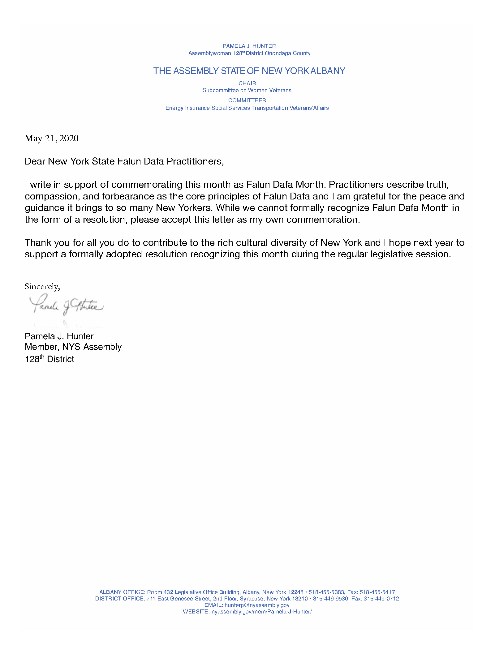 州众议员亨特(Pamela J. Hunter)在信中祝贺五月为“法轮大法月”。亨特表示真善忍是法轮大法的核心原则,感谢法轮大法给许多纽约人带来的平和与指导。并说纽约州议会今年无法以正式决议的形式褒奖法轮大法月,请接受这封信作为她个人的祝贺。 州众议员亨特在信中说感谢你们为丰富纽约文化多样性所做的一切,希望明年在例行立法会议恢复正常后能够以正式通过决议的方式来祝贺法轮大法月。