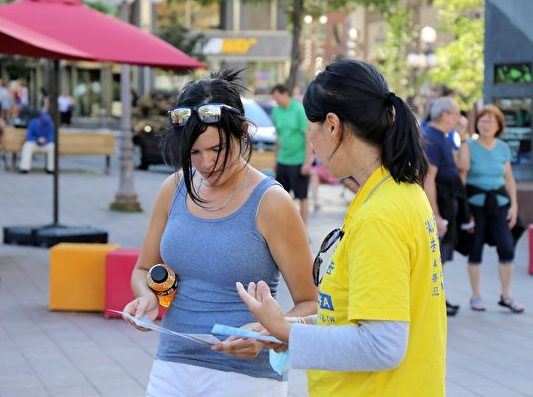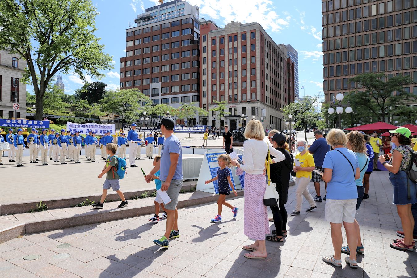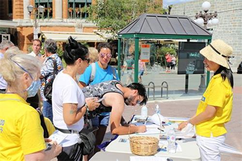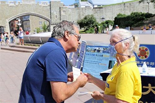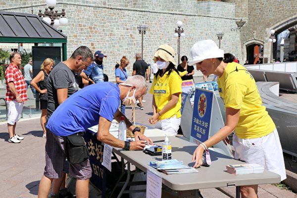 图6~7:2020年8月22日,法轮功学员在魁北克省府魁北克市中心的杜维尔(D'Youville)广场传递真相,呼吁结束中共对法轮功长达21年的迫害。现场民众踊跃签署请愿信。 |