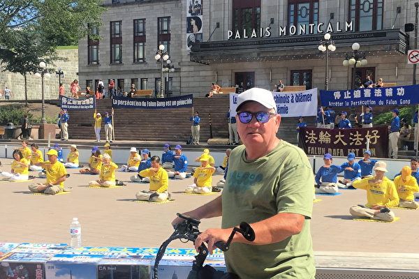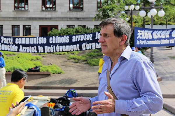 维罗尼克·罗艾尔(Véronique Ruel)认真观看法轮功学员打坐的场景,她说:“我反对(中共的迫害),就像所有人一样。”尽管中共并不能够接受外界的意见,她还是希望这样的集会能够坚持举行,唤醒民众。作为一名加拿大人,她相信加拿大政府首先能做的就是收紧对那些侵犯人权者的签证政策。最后,她鼓励说:“你们的抗争就是我们的抗争”,世界站在法轮功学员这一边。 “中国人民是中共的首要受害者”  图9:阿尔伯特·加涅(Albert Gagné)谴责中共活摘法轮功学员器官是“毫无人性” |